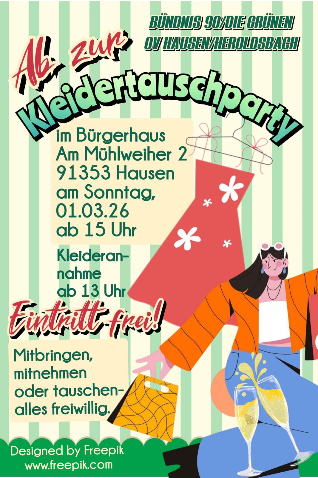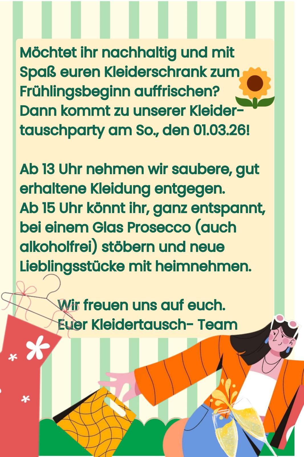 Möchtet Ihr nachhaltig und mit Spaß zum Frühling Euren Kleiderschrank auffrischen? Dann kommt zur Kleidertauschparty! Ab 13 Uhr nehmen wir saubere, gut erhaltene Kleidung entgegen. Ab 15 Uhr könnt Ihr ganz entspannt stöbern und neue Lieblingsstücke mit nach Hause nehmen.